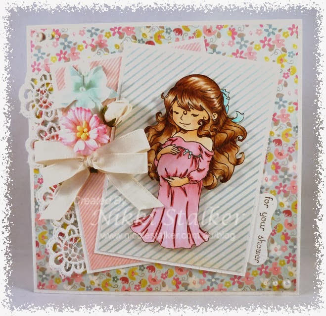 Nikki colored her Welcome Little One image with copic markers and then added a stunning spray of flowers, a gorgeous ribbon and some lovely lace to complete her card!